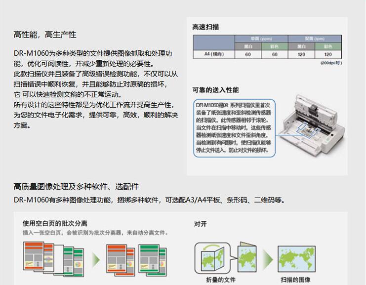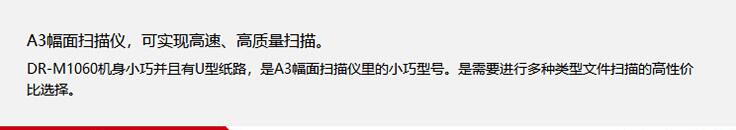商品属性 [品牌] 佳能 [型号] DR-M1060 [幅面] A3 [类型] 馈纸式 [多介质扫描] 是 [分辨率(平板/馈纸式)] 600dpi [扫描元件] CMOS [质保时间] 1年 [随机配件] 标配 [售后服务内容] 1年质保