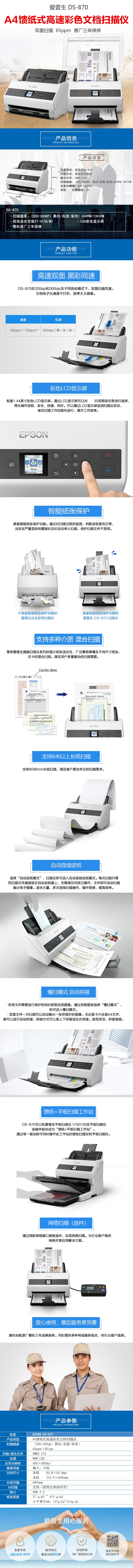 爱普生(EPSON)DS-870 A4馈纸式高速彩色文档扫描仪 双面扫描/65ppm (原厂三年保修)邮政