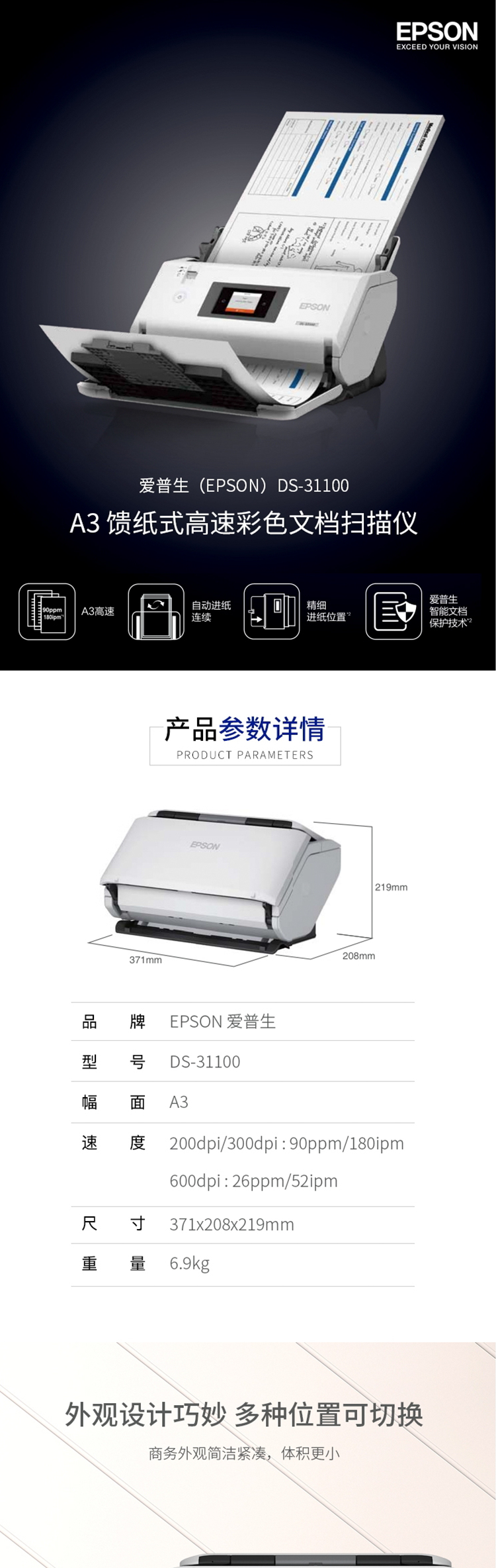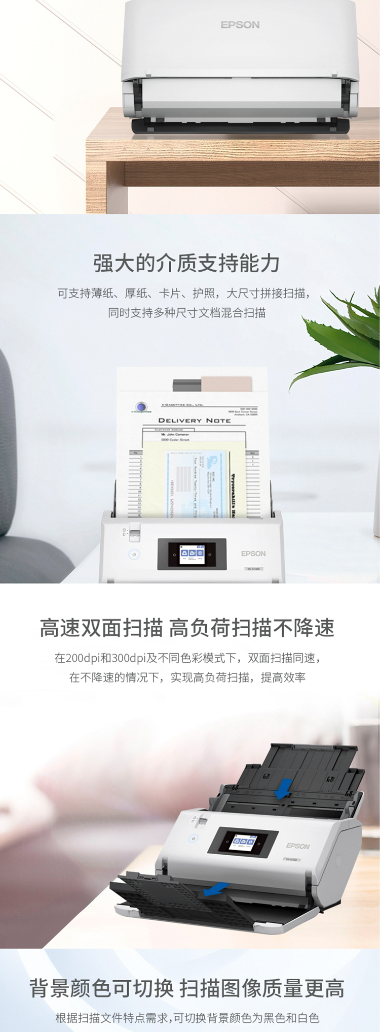 爱普生(EPSON)DS-31100 A3大幅面馈纸式彩色文档高速扫描仪 90ppm 教育阅卷/档案/财务票据/金融资料