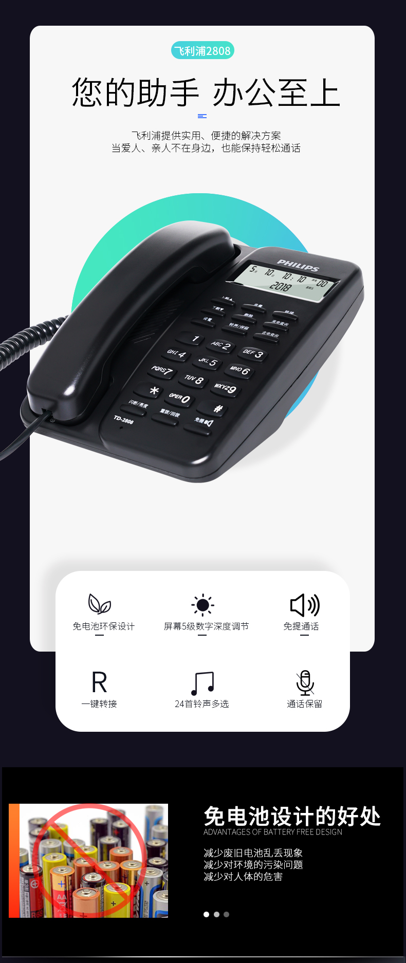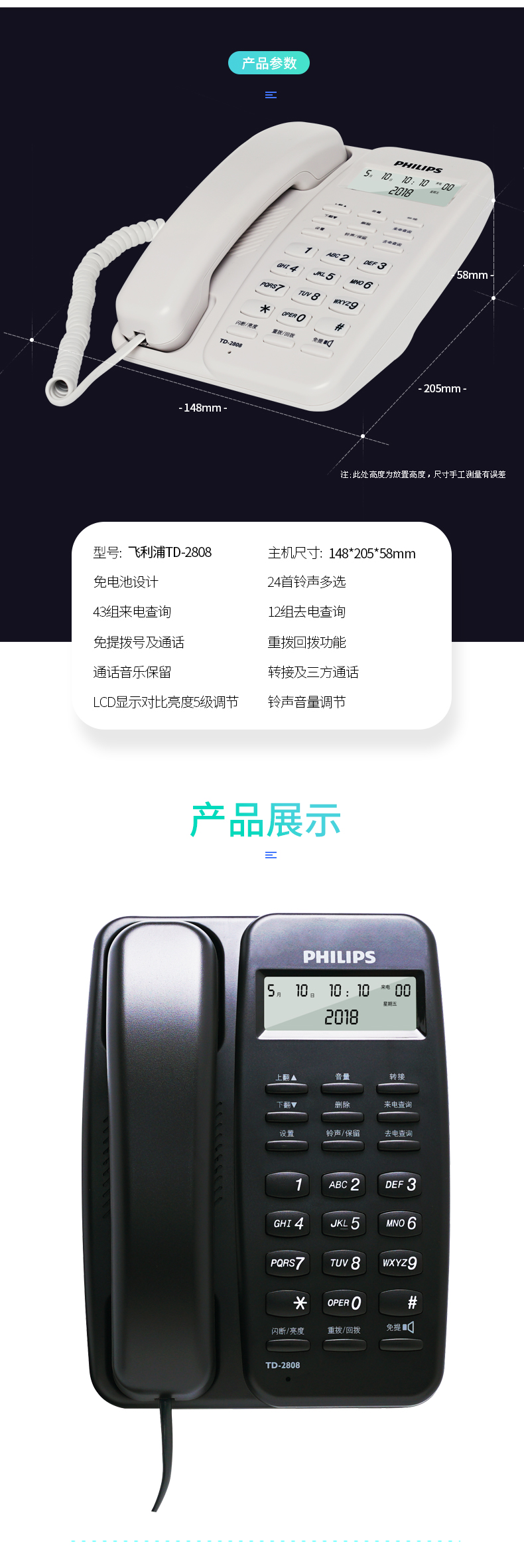 飞利浦(PHILIPS)电话机座机 固定电话 办公家用 免电池设计 来电显示 TD-2808 (黑色)