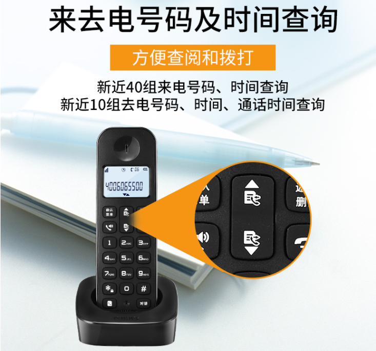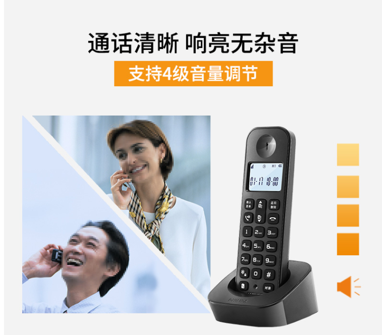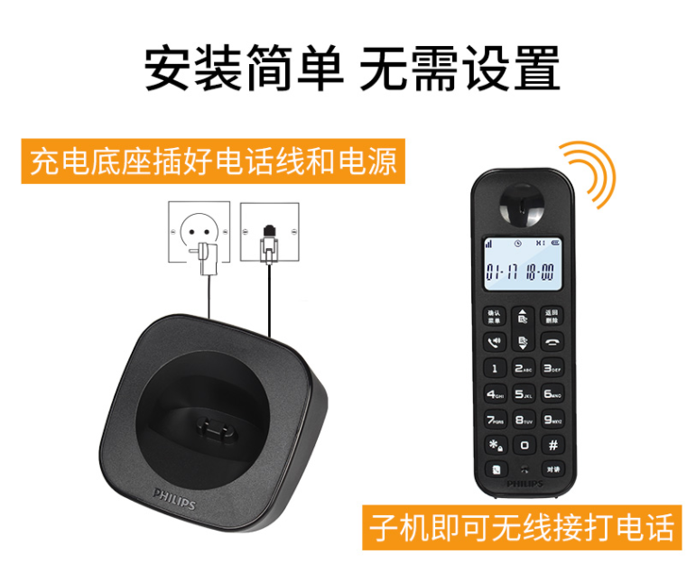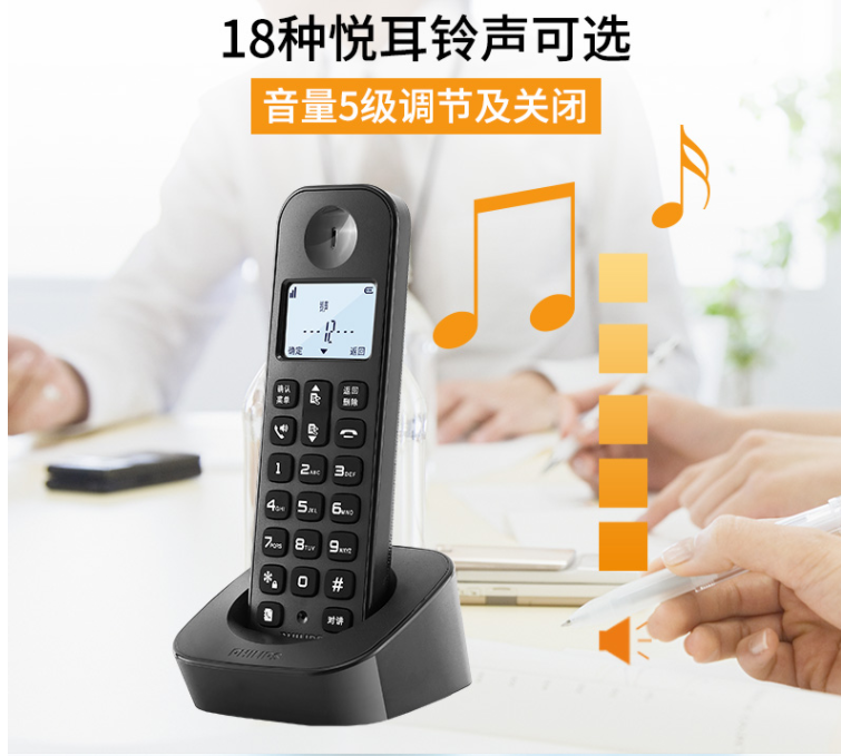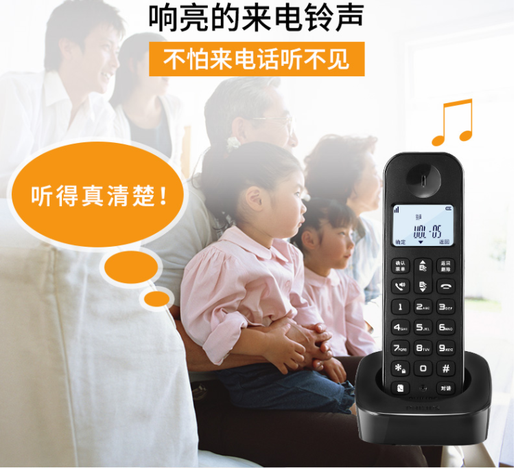 飞利浦 PHILIPS 数字无绳电话机/无线座机/子母机 内部对讲 三方通话 高清免提 家用办公 DCTG1602(黑色)