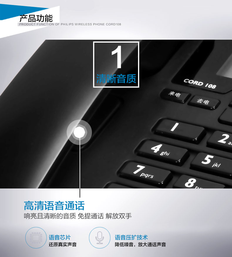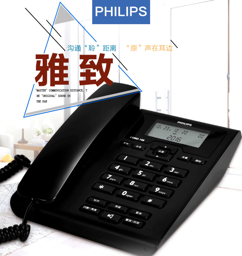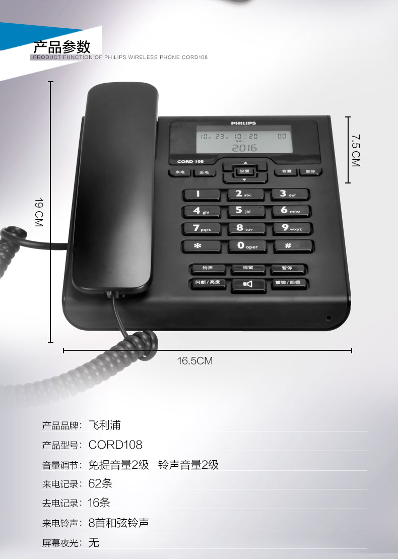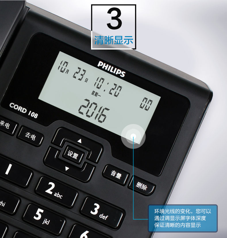 飞利浦(PHILIPS)电话机座机 固定电话 办公家用 免电池 来电显示 免提通话 CORD108 (黑色)
