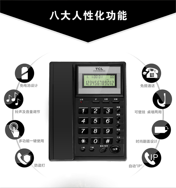 TCL HCD868(17B)TSD固定有绳电话机座机来电显示免电池免提屏幕翻转座式壁挂家用办公有绳固话(灰白)
