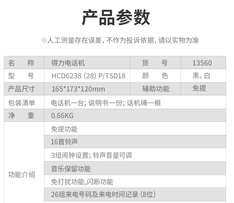 得力(deli) 电话机座机 固定电话 办公家用 45°倾角 亮度可调 13560黑