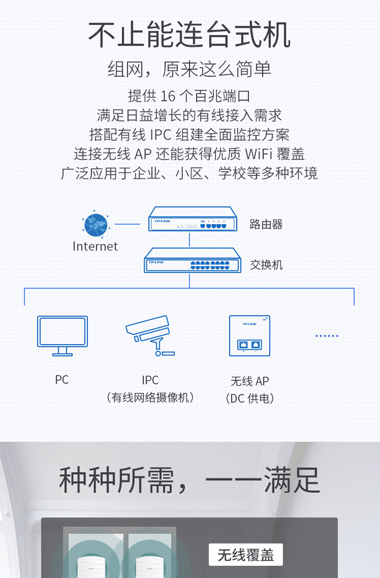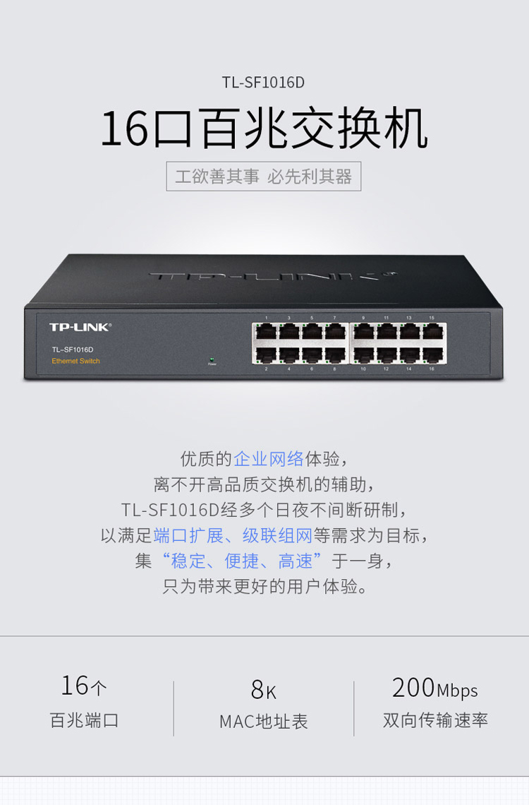 TP-LINK 16口百兆非网管交换机 监控网络网线分线器 企业级分流器 金属机身 TL-SF1016D