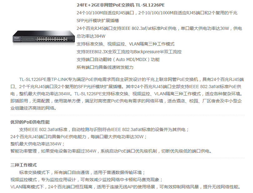 TP-LINK SL1226PE 24口百兆POE交换机 2千兆口+2千兆光纤口