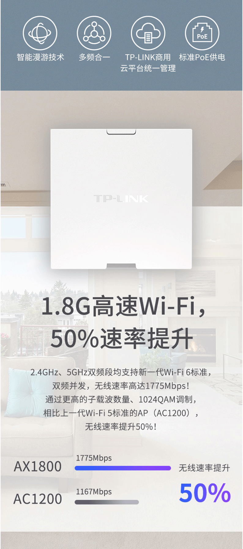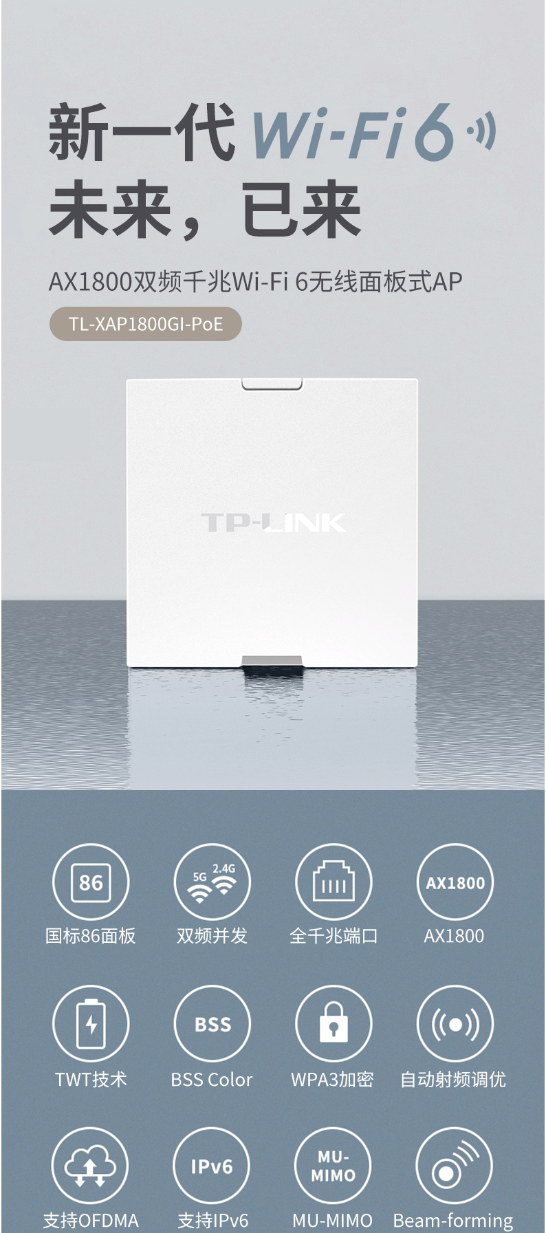 TP-LINK AX1800双频千兆Wi-Fi 6无线面板AP 企业酒店别墅wifi无线接入点 PoE供电AC管理 TL-XAP1800GI-PoE