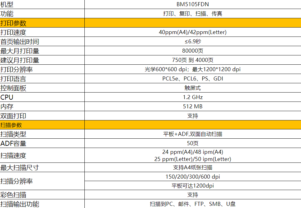 奔图(PANTUM) BM5105FDN黑白激光多能一体机(40页每分钟/复印/打印/扫描/传真/双面打印/USB打印/网络打印/带自动输稿器/可加大容量纸盒)