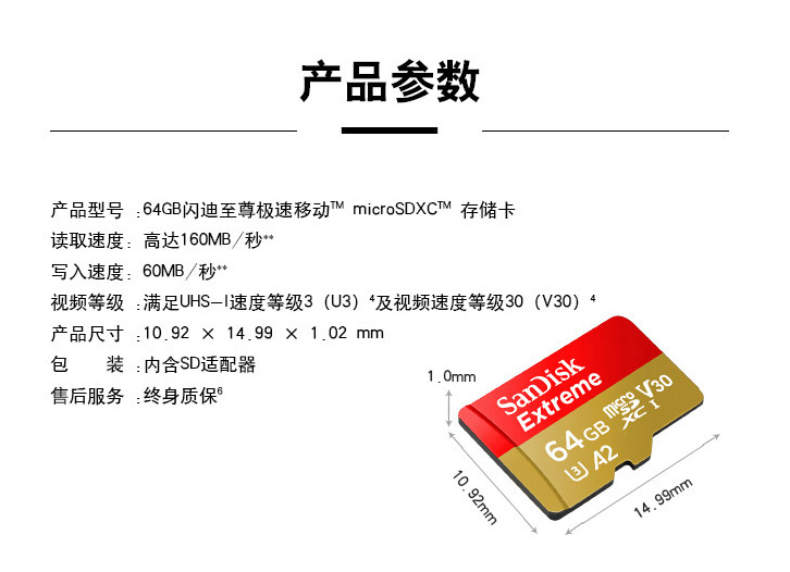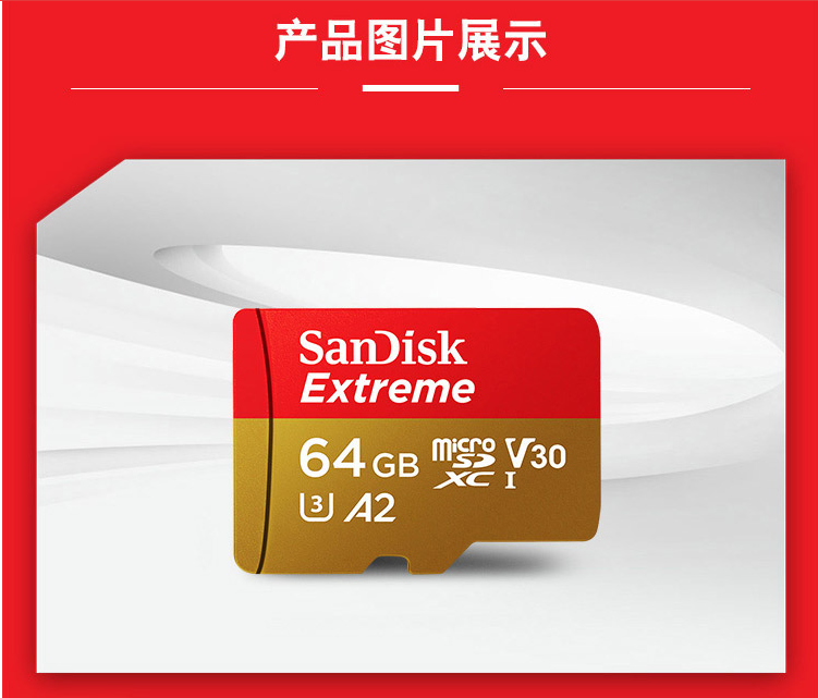 闪迪(SanDisk)64GB TF(MicroSD)存储卡 U3 C10 A2 V30 4K 至尊极速移动版内存卡 读速160MB/s 写速60MB/s