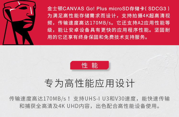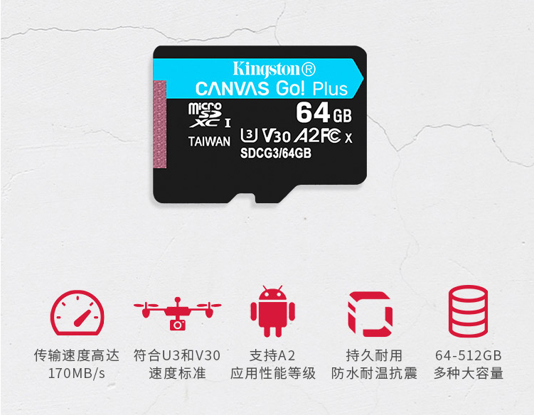 金士顿(Kingston)64GB TF(MicroSD)存储卡 行车记录仪内存卡 手机内存卡 U3 V30 A2 4K 读速170MB/s