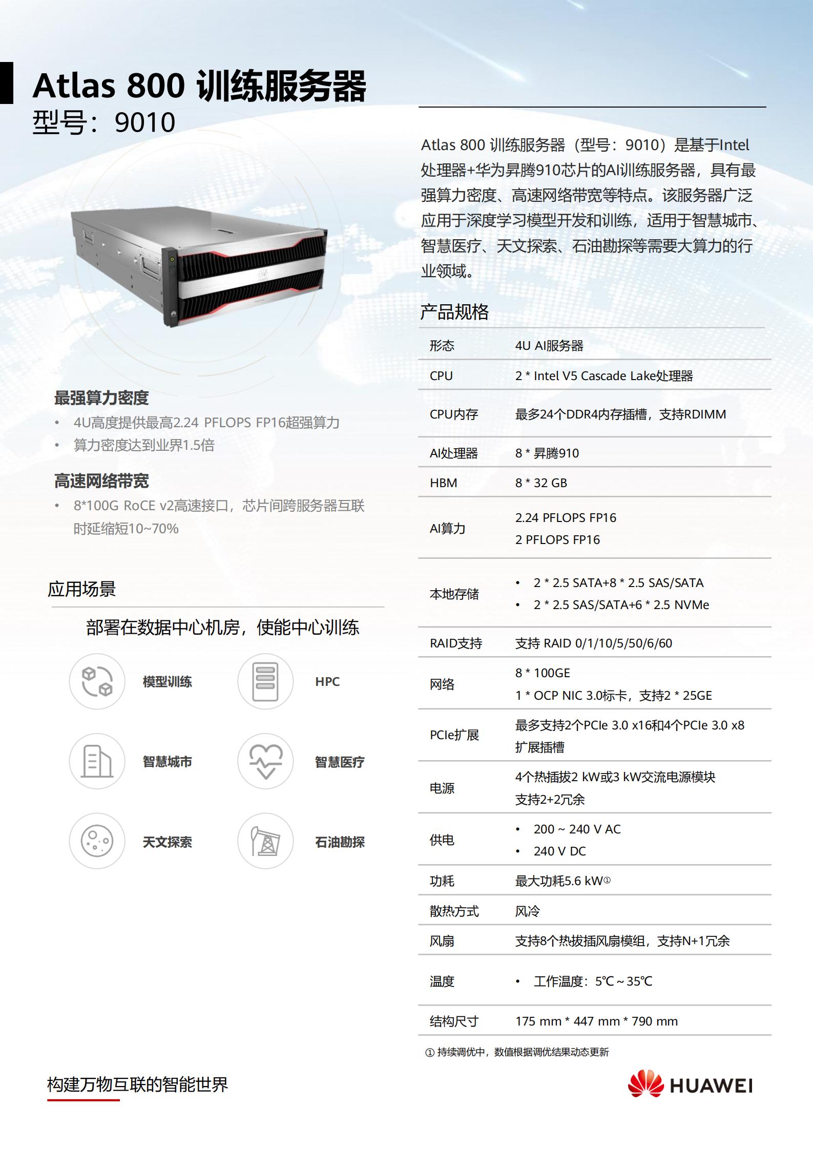 华为Atlas800(9010)服务器2*5218/8*32G/2*480G SSD+4*192G SSD/4*昇腾910 32G/4*10GE光口/4*100GE光口/三年质保服务