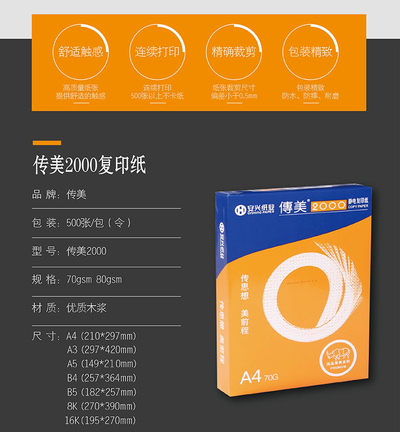 传美2000复印纸 A3 80G 500张/包 单位:包