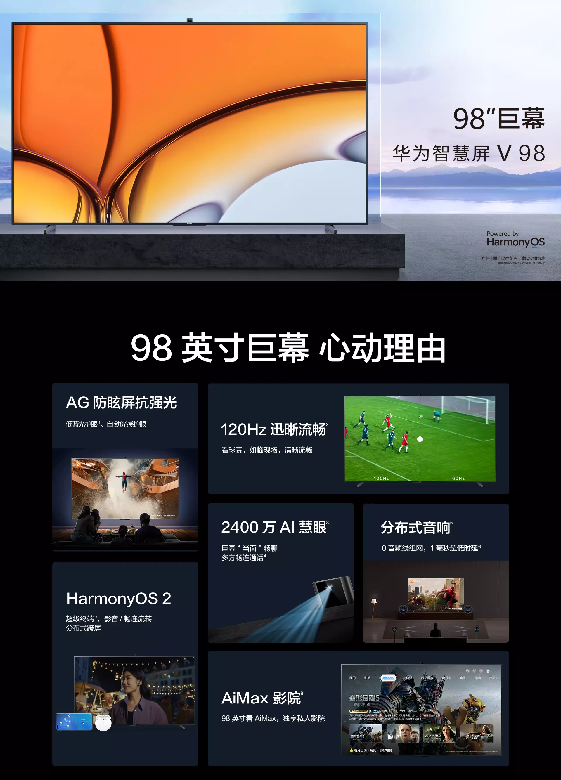 华为智慧屏 V 98 98英寸巨幕影院 120Hz高刷 AG防眩屏 2400万高清AI慧眼 分布式音响 鸿蒙HarmonyOS 2