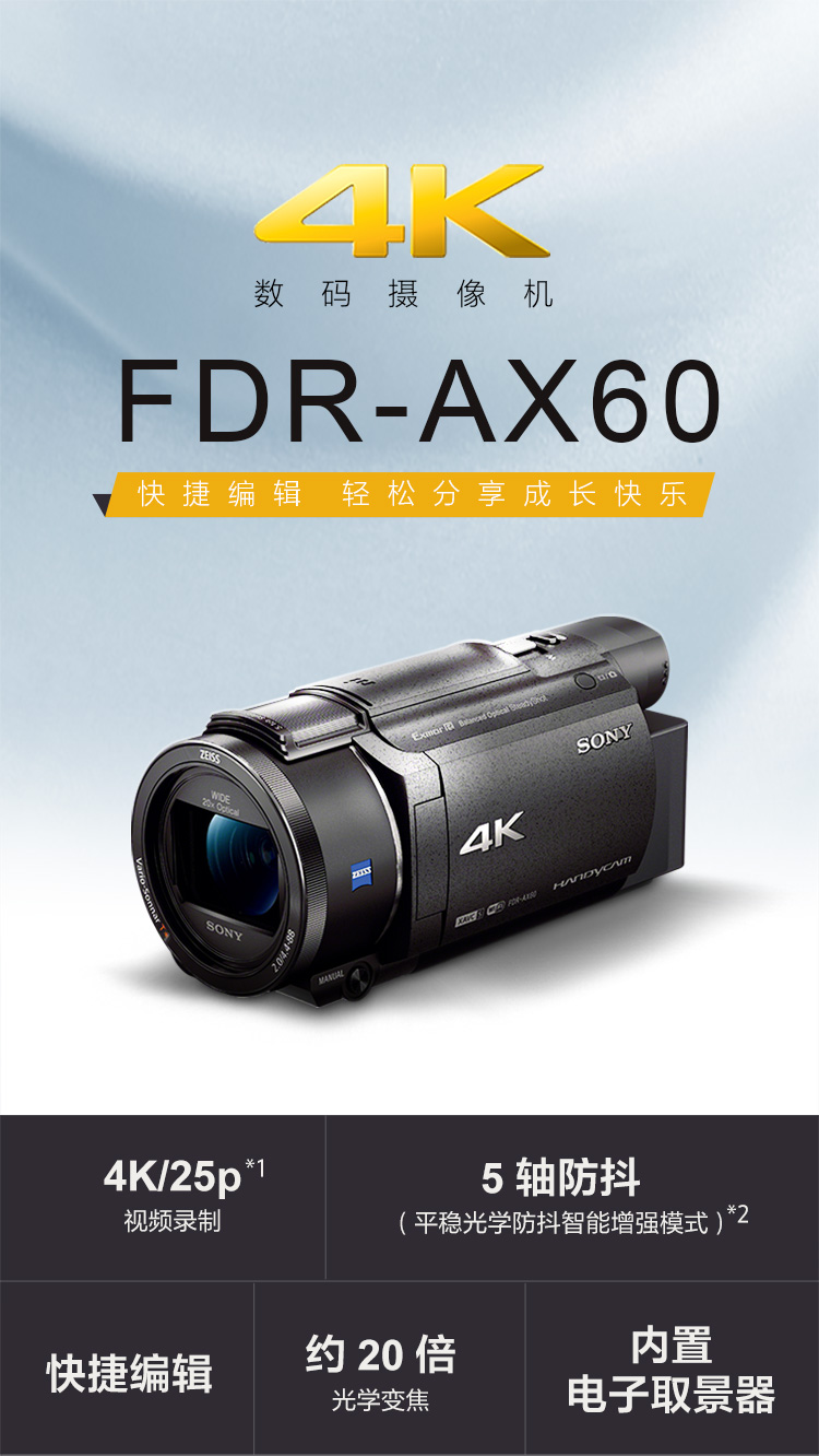 索尼(SONY)FDR-AX60 家用/直播4K高清数码摄像机 DV/摄影/录像(含三角架*1,相机包*1,两块电池,内存卡256G*1)