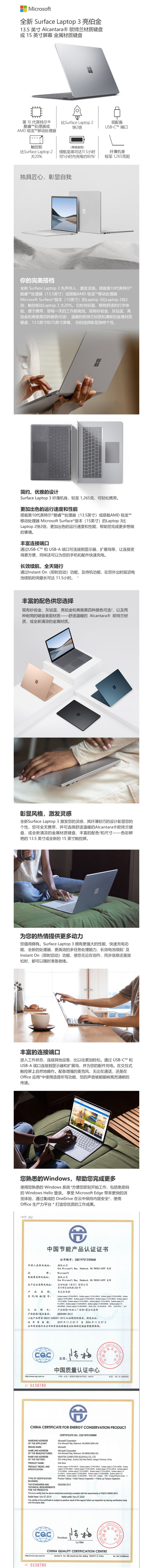 微软 Surface Laptop 3 超轻薄触控笔记本电脑 13.5英寸 十代酷睿i5 8G 256G SSD W10中文版,银色