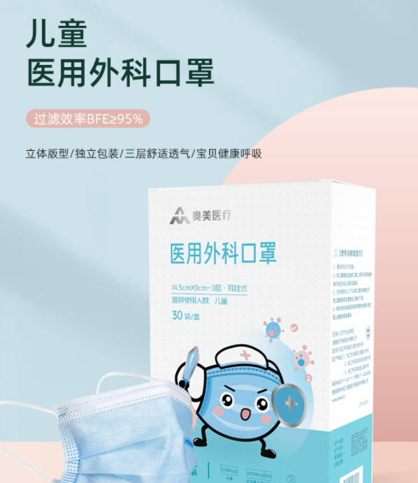 奥美医疗 儿童口罩 医用外科防雾霾沙尘飞沫柳絮花粉透气无菌独立口罩 宝宝幼儿口鼻防护独立口罩 30只装/盒
