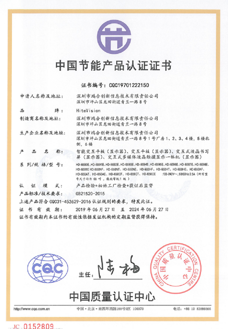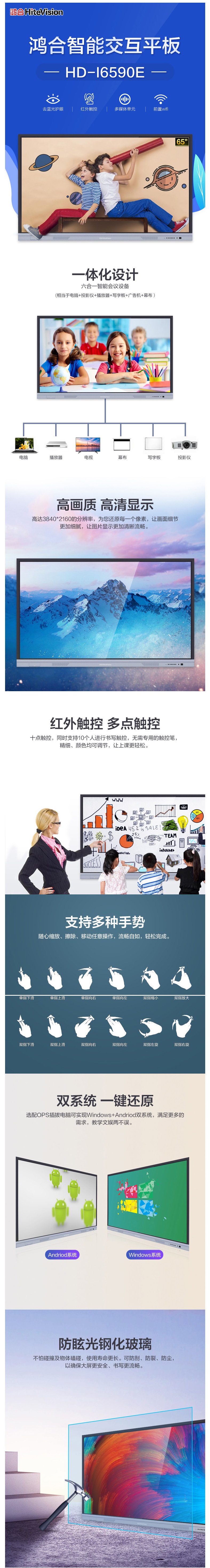 鸿合 HD-I6590E 65英寸交互平板(I5/8GB/256GSSD/正版WIN10Pro/智能笔/实物展台/集控管理平台/3年保修/安装调试)-银灰色