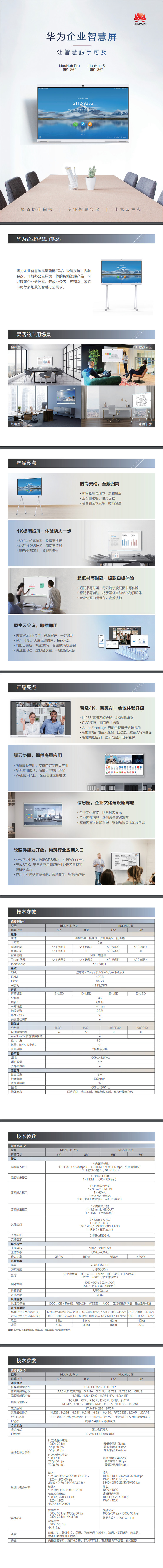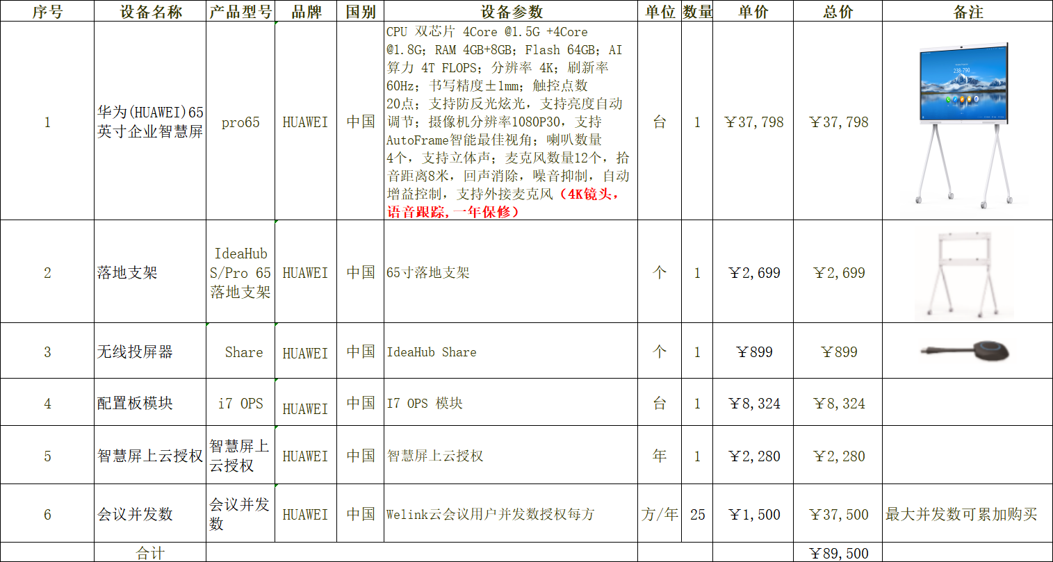 华为(HUAWEI)65英寸企业智慧屏(会议平板/视频会议/无线投屏/智能语音/海量APP应用/会议平台解决方案)配移动支架+IdeaHub Share无线传屏器*1+i7 ops处理模块,一年维保,一年硬件上云服务,welink云视频会议授权