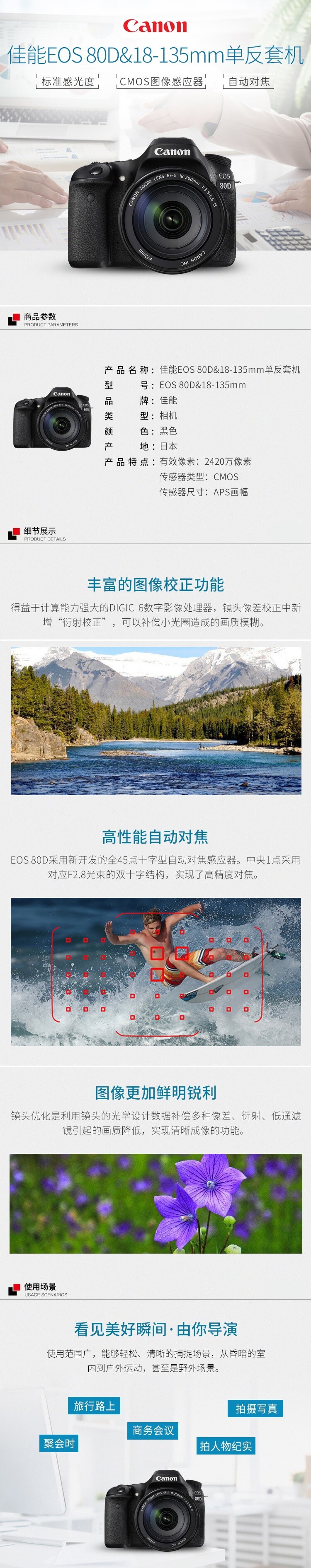 佳能 EOS 80D 单反套机(EF-S 18-135mm f/3.5-5.6 IS/USM/单反镜头/闪迪128G卡/原装电池/佳能原装包/沣标FB-254L+ FB-Q36J三脚架/沣标清洁套装/沣标读卡器)