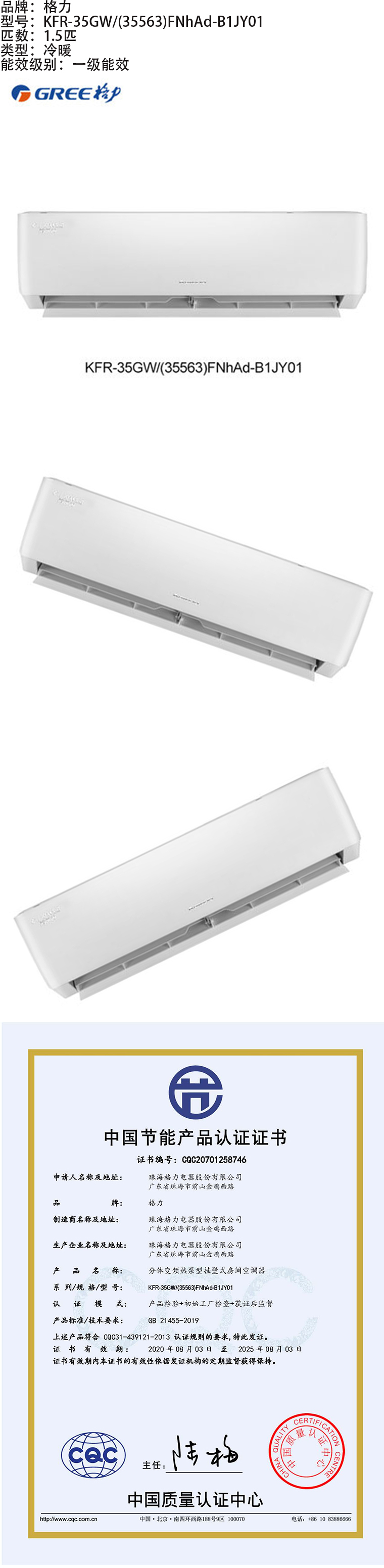 格力(GREE)KFR-35GW/(35563)FNhAd-B1JY01 1.5匹冷暖变频壁挂式空调(含铜管,排水管,支架及其他辅材)