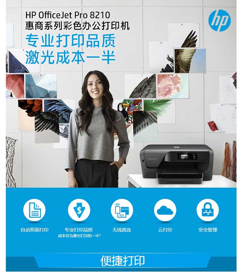 惠普打印机 OfficeJet Pro 8210 彩色喷墨无线打印机 自动双面打印 无线直连