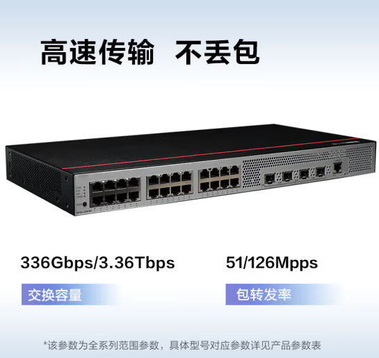 华为数通智选交换机S5735S-S24T4X-XA(24个10/100/1000BASE-T以太网端口,4个万兆SFP+) 交换容量336Gbps/3.36Tbps,包转发率108/126Mpps,支持双电源,自带1个60W交流电源,含4根5米单模跳线,1年保修