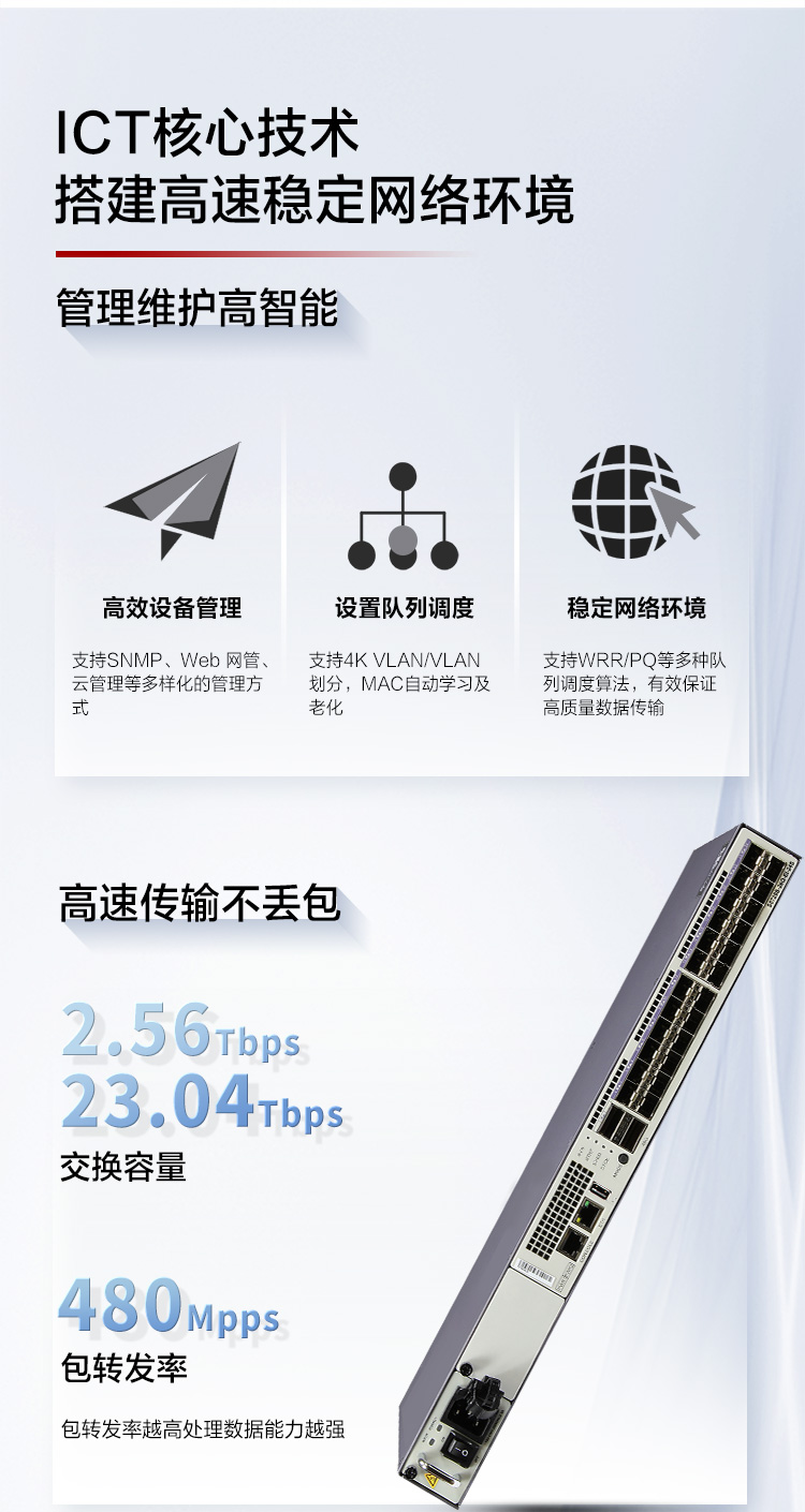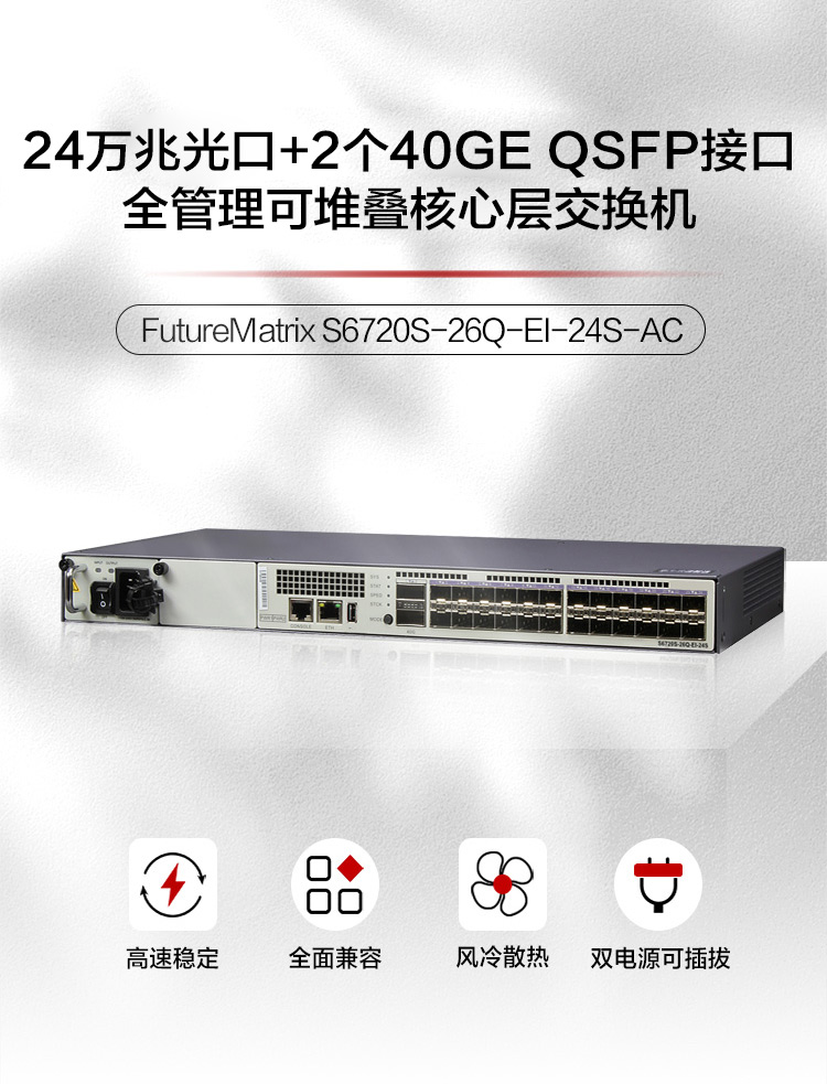 华为S6720S-26Q-EI-24S-AC 24口万兆交换机 组合配置(24个万兆SFP+,2个40GE QSFP+,含1个170W交流电源) 交换容量2.56Tbps/23.04Tbps,包转发率480Mpps,支持双电源,支持扩Vxlan、SVF parent