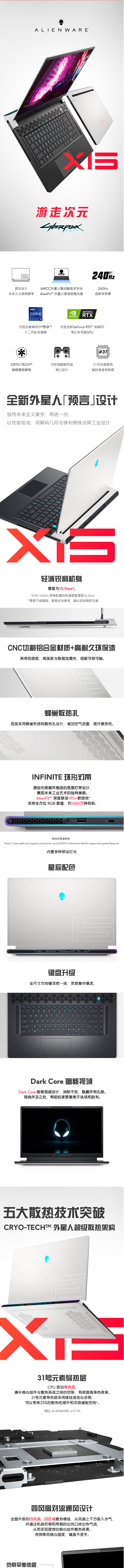 戴尔ALIENWARE x15R2 15.6英寸高端游戏本12代i9 32G 1T RTX3080Ti QHD 240Hz高刷屏轻薄笔记本电脑