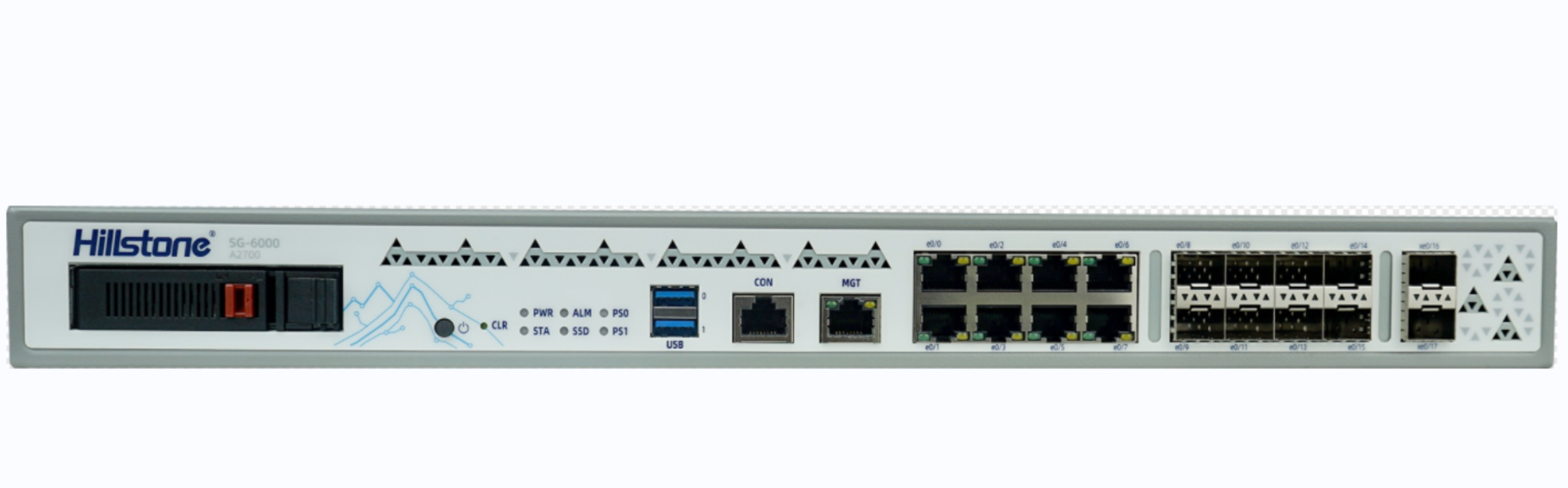 山石网科 SG-6000-A2700软硬件平台基本系统,含硬件保修、应用识别库升级和软件升级维护服务。硬件参数:机架型1U,2×10GE + 8×GE(光) + 8×GE(电) + MGT,交流单电源,不带硬盘,硬盘另外下单;性能参数:吞吐10G,并发150万,新建13万;1年原厂维保;