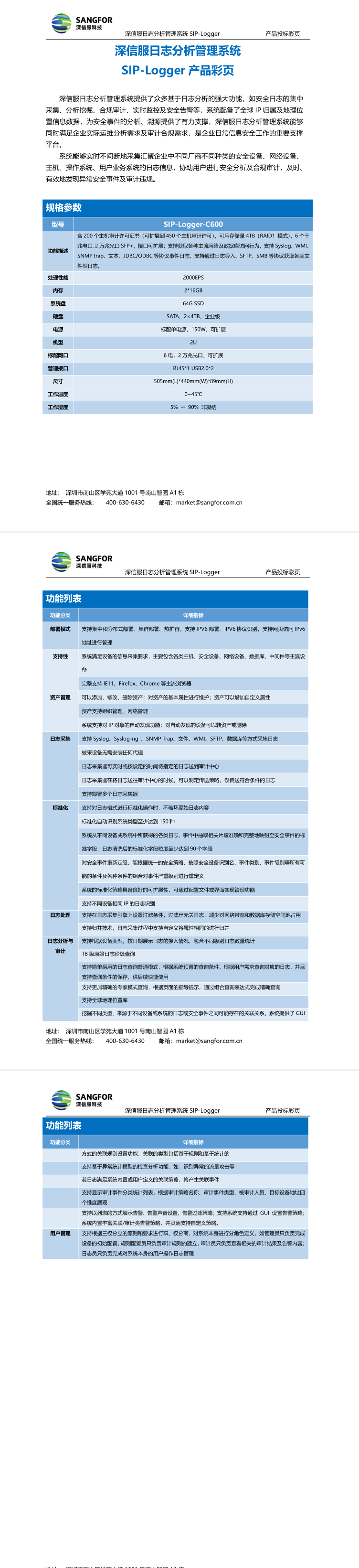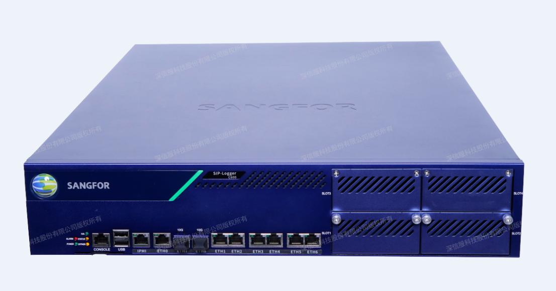 深信服日志审计分析管理系统SIP-Logger-C600 硬件参数:规格:2U,内存大小:32G,硬盘容量:64G minisata+4T SATA*2,电源:单电源,接口:6千兆电口+2万兆光口SFP+。