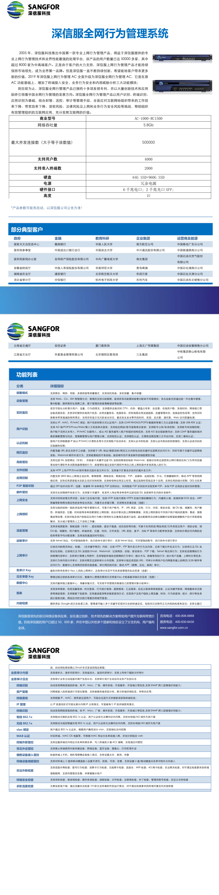 深信服全网AC AC-1000-RC1500 硬件参数:规格:1U,内存大小:8G,硬盘容量:2T SATA,电源:单电源,接口:6千兆电口+2万兆光口SFP+。
