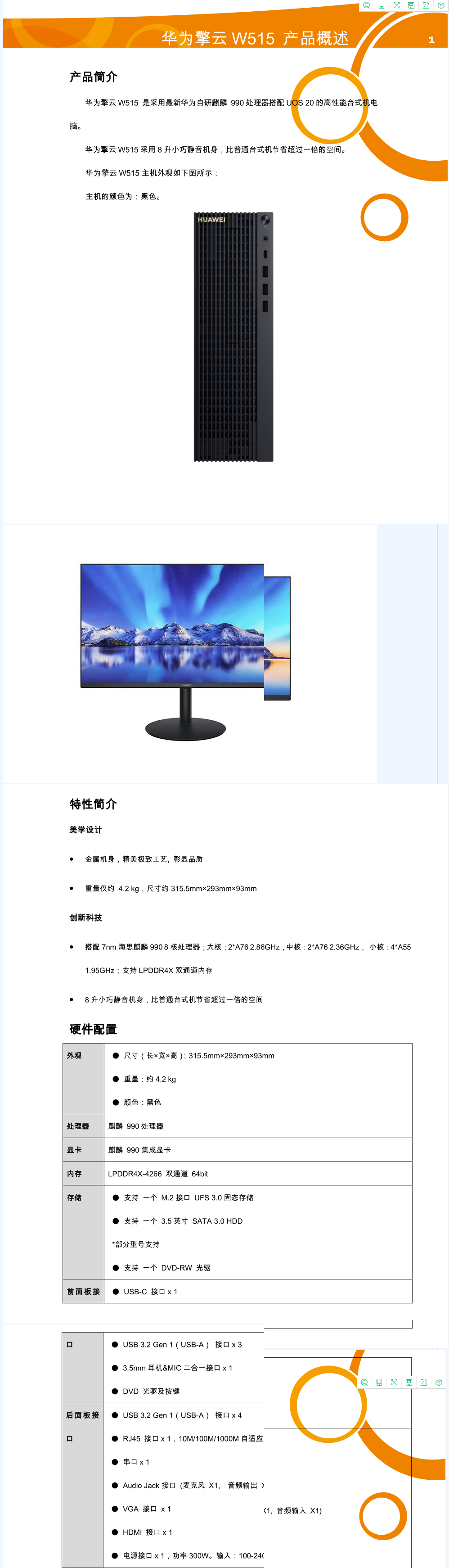 华为 擎云W515 台式电脑(麒麟990 8核/8GB/256GB SSD/集成显卡/光驱)+23.8英寸显示器 3年保修一年上门服务