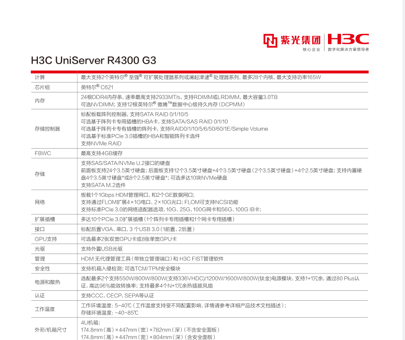 新华三H3C UniServer R4300 G3服务器 2*英特尔至强可扩展处理器5220R(24核,2.2Ghz)/24*32G内存/ 2*600GB SAS HDD硬盘 / 2* 1.92TB SATA SSD硬盘 / 6 * 6T SAS HDD硬盘 / 2*800W电源/3年7×24原厂维保