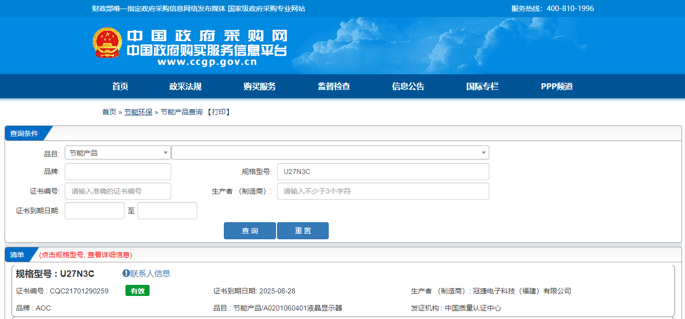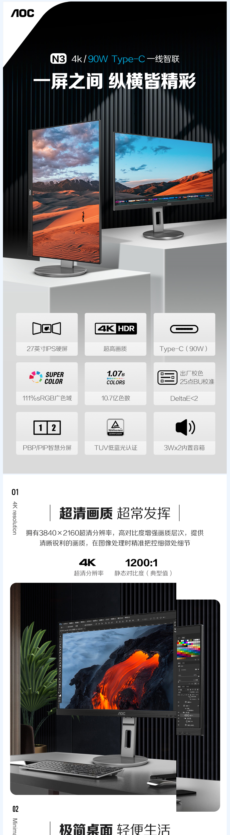 AOC U27N3C 27英寸 4K高清 IPS HDR 显示器/TUV爱眼认证/双向旋转升降/内置音箱/Type-C接口90W (台)