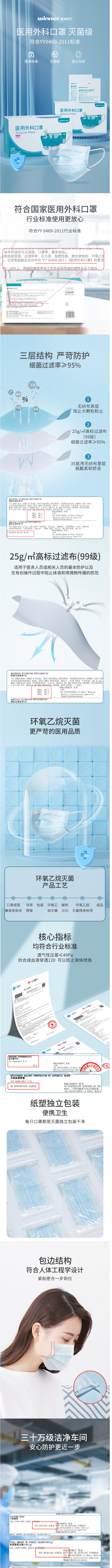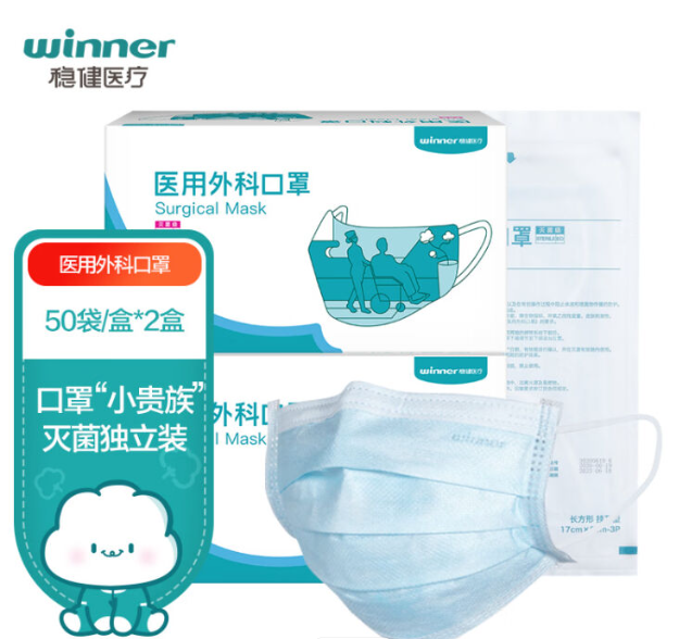 稳健(Winner)一次性医用外科口罩灭菌独立装100只 3层挂耳50袋/盒*2盒装:单位:片