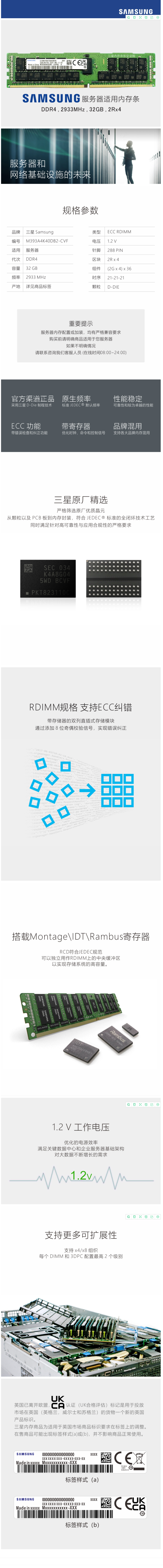三星 SAMSUNG 存储服务器内存条 32G DDR4 RECC 2R×4 2933频率 M393A4K40DB2-CVF