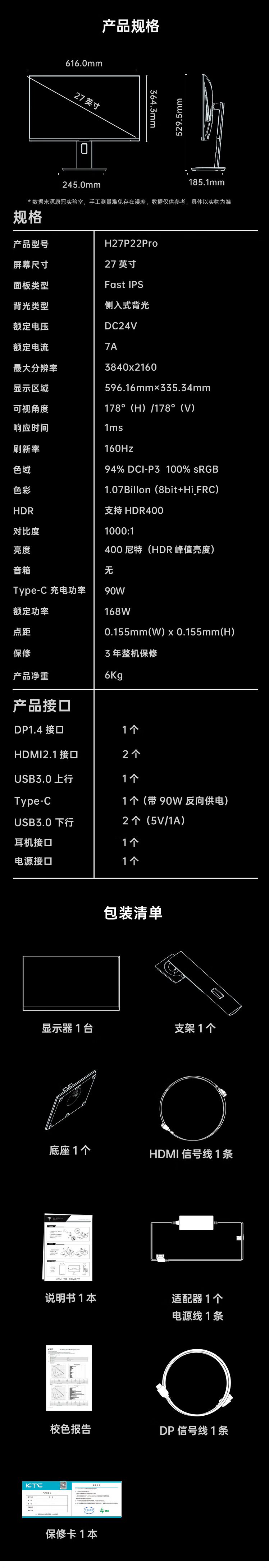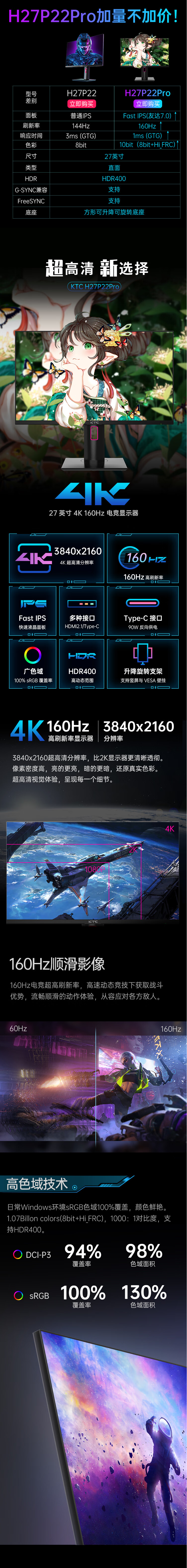 KTC 27英寸 电脑显示器 HDR400 升降旋转壁挂 电竞4k显示屏 H27P22Pro