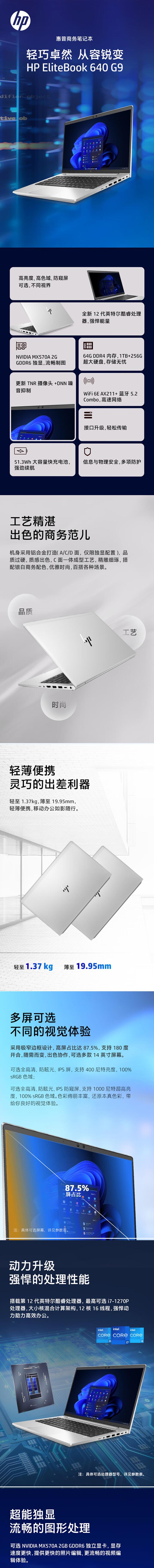 惠普 Elitebook640 G9 笔记本电脑 银色/i7-1255U/14'' FHD(1920X1080) IPS高清防眩屏/16GB DDR4 3200 (1x16GB)内存/1TB M2 PCIe NVMe SSD固态硬盘/集成显卡/Wifi 6E AX 2x2(intel)+蓝牙5.2/720P高清摄像头/指纹识别/背光键盘/3芯42WHr长寿命电池/Win11 HB 64位(简体中文版)