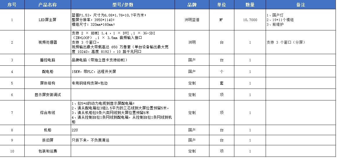 洲明蓝普P1.53室内LED显示屏10.7㎡(含视频处理器、播控电脑、配电柜、屏体结构、机柜、综合布线/运输安装调试/保修1年)单位:套
