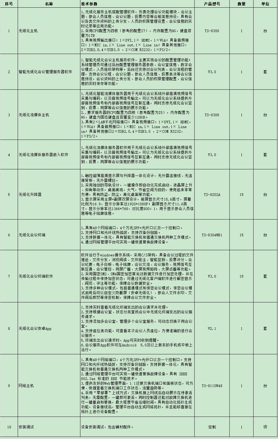 itc无纸化会议系统1套(含无纸化主机*1台/智能无纸化会议管理服务器软件*1套/无纸化流媒体主机*1台/无纸化流媒体服务器嵌入软件*1套/无纸化升降器*15台/无纸化会议终端*15台/无纸化会议终端软件*15套/无纸化会议安卓App*1套/网络主机*1套/辅材+安装调试/质保三年)